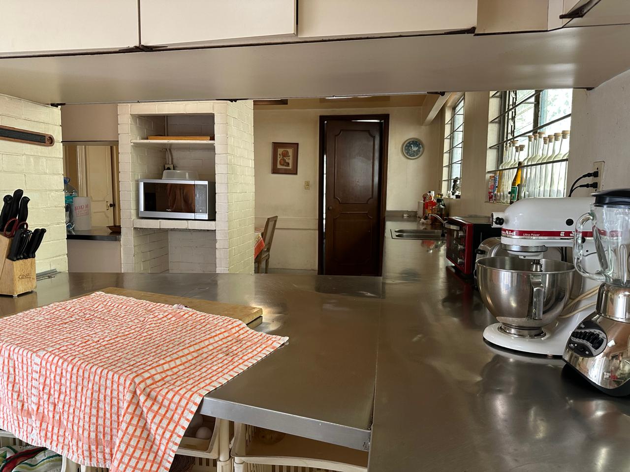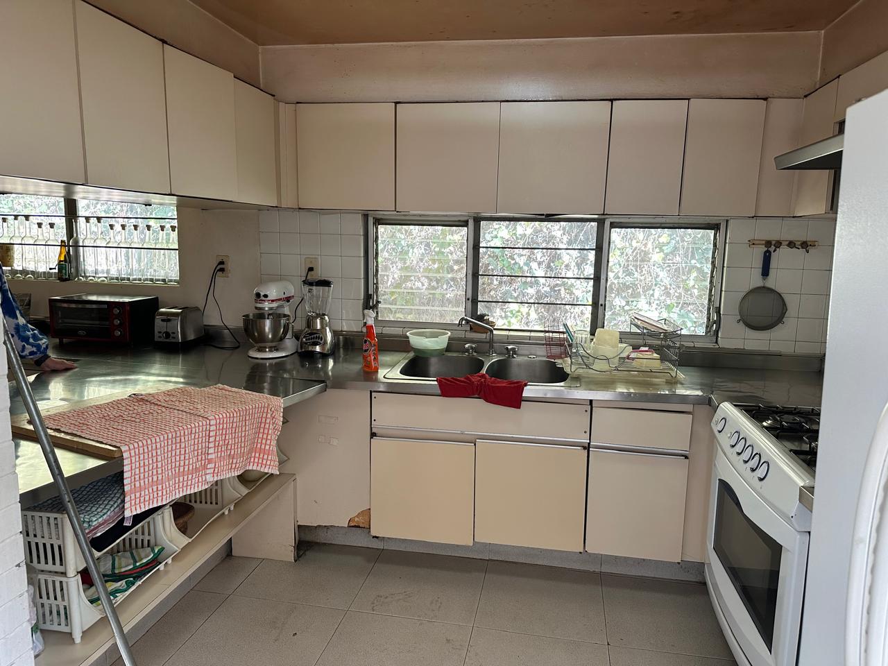 La cocina está de lado derecho y muy amplia, con dos despensas, y atrás de ella está el patio de servicio, el cuarto de lavado y dos cuartos de servicio.
