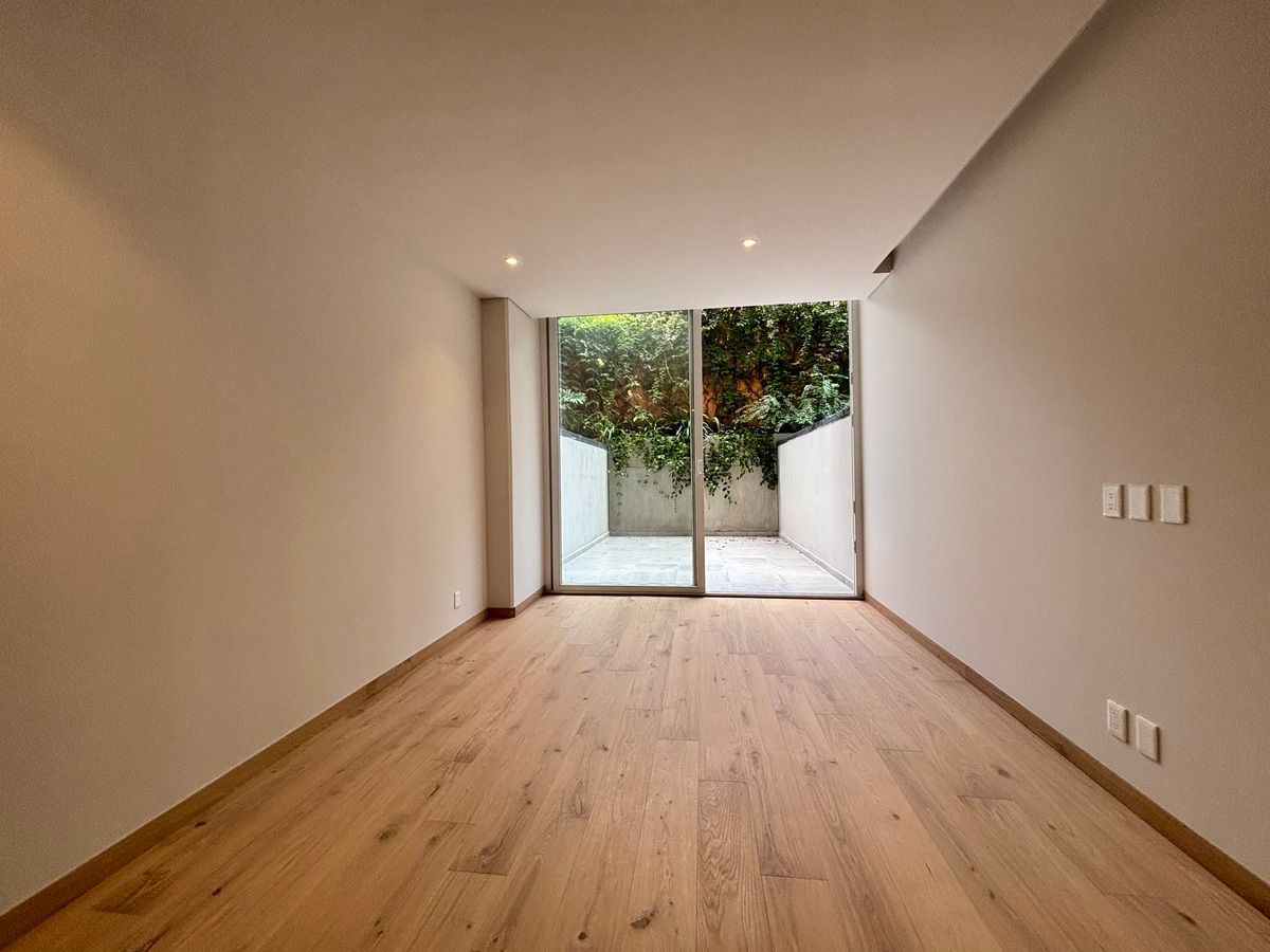 Acogedor departamento interior con una función de elegancia y comodidad, cálido e iluminado con luz natural en todas sus áreas, sin ruido, con acabados de lujo, sus espacios son amplios, armoniosos, con altura de 3 metros, ventanas de piso a techo, ubicado en el nivel Garden en planta baja, y listo para habitarse