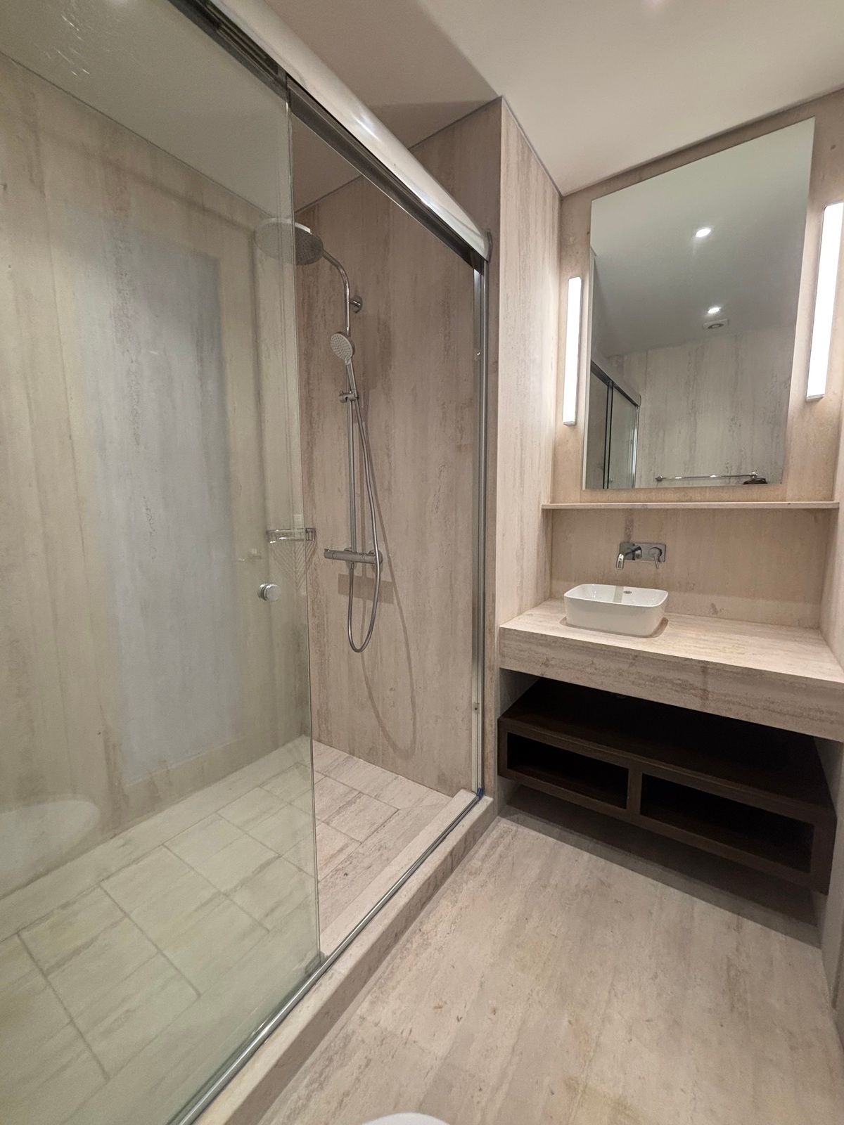 Cocina abierta tipo italiana con cuarzo, parrilla eléctrica, 1 recamara con ventanal de piso a techo con vista a muro verde, clóset, un baño con acabados en vidrio templado, banca de descanso en regadera, marmol Travertino en muros y piso.