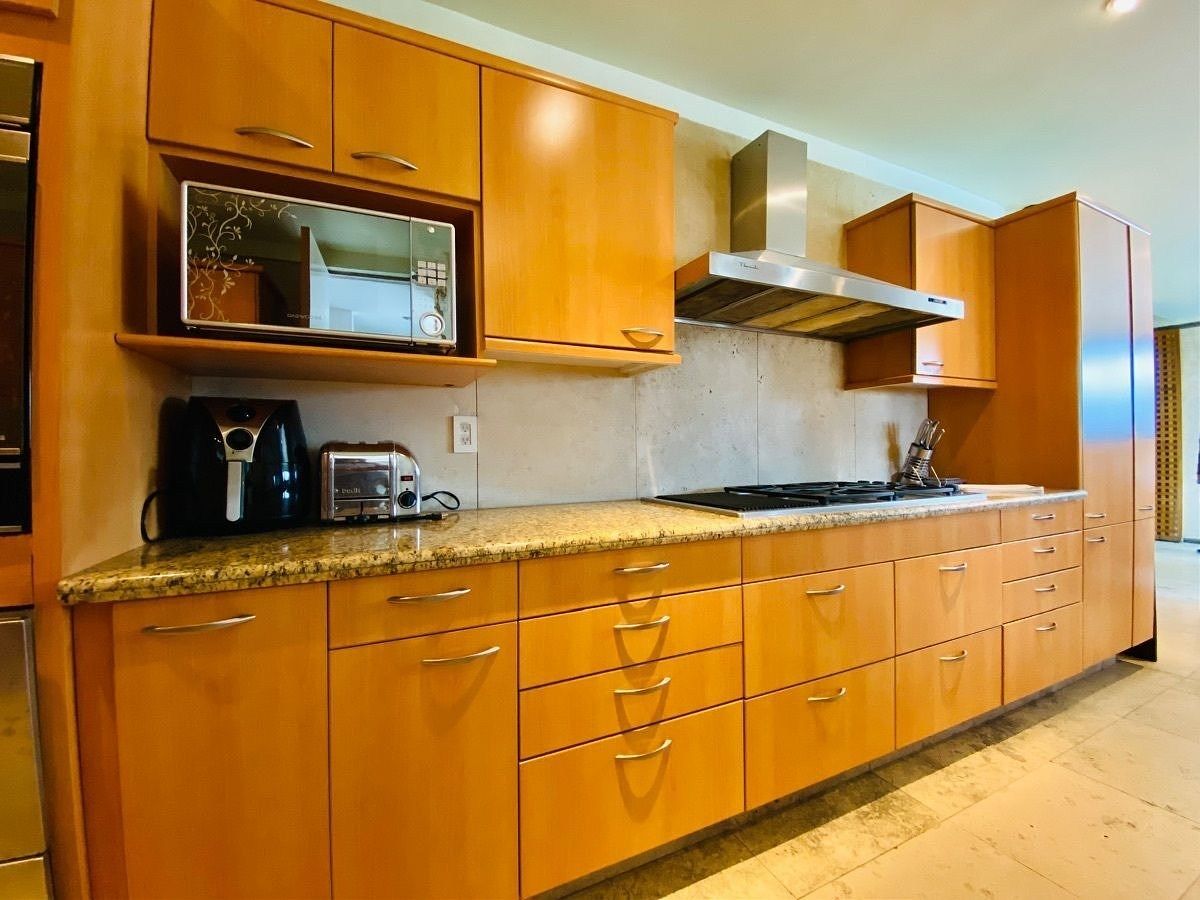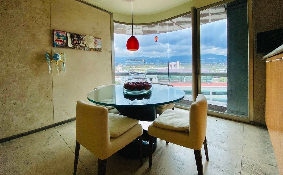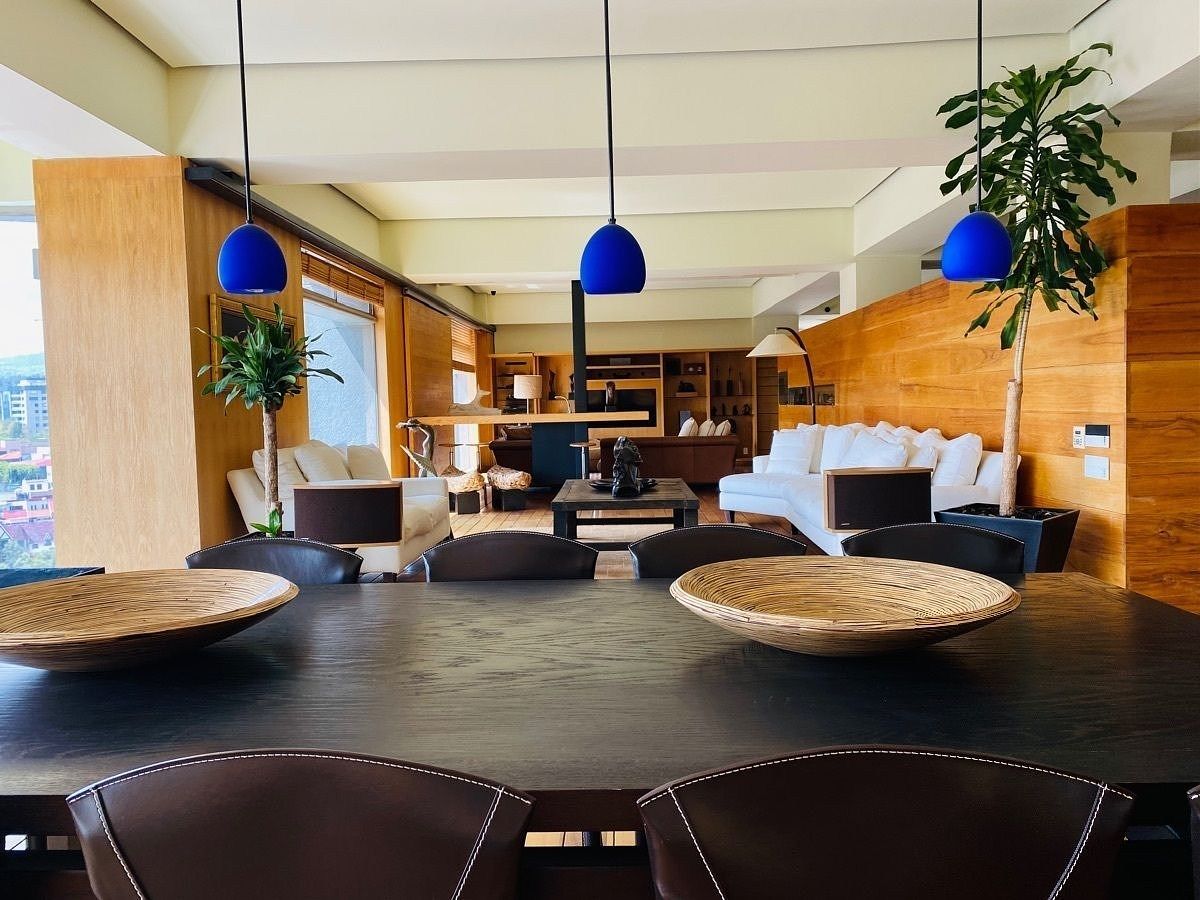 Amueblado completamente con excelente gusto, finos y modernos acabados, pisos de mármol y duela de madera, privilegiada vista panorámica en todo el departamento dándo una increíble luz natural a cada uno de los amplios espacios , cuenta con estancia comedor, sala, un funcional bar con todo lo necesario como cava,medio baño de visitas, un family amplio, estudio con agradable terraza, cocina integral equipada con barras de granito, con desayunador, área de lavado integrada.