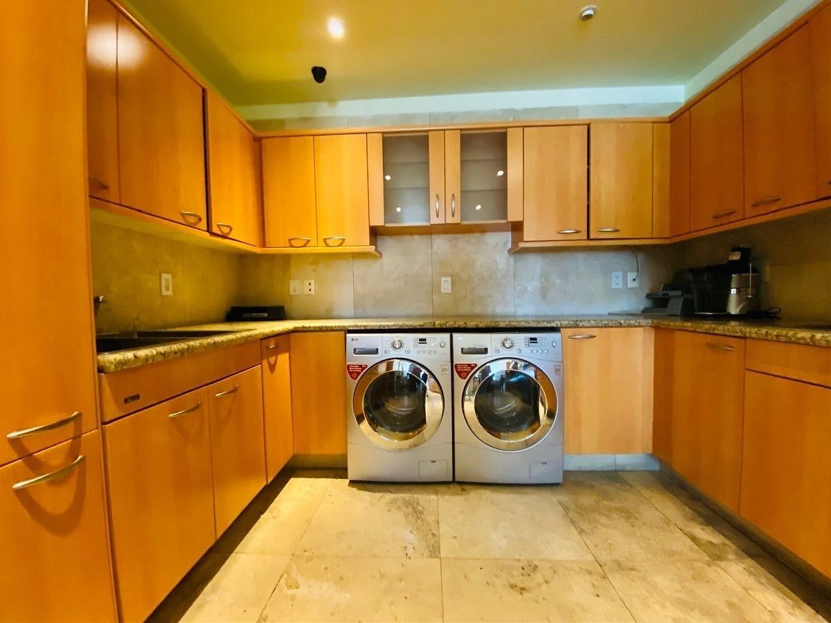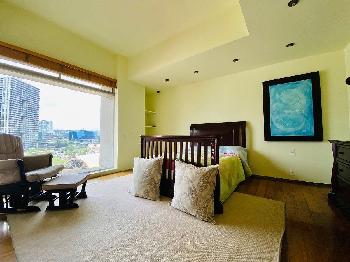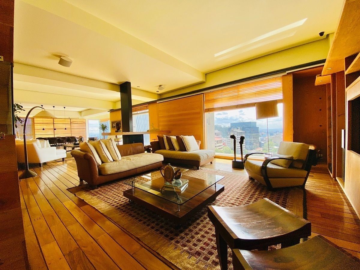 Amueblado completamente con excelente gusto, finos y modernos acabados, pisos de mármol y duela de madera, privilegiada vista panorámica en todo el departamento dándo una increíble luz natural a cada uno de los amplios espacios , cuenta con estancia comedor, sala, un funcional bar con todo lo necesario como cava,medio baño de visitas, un family amplio, estudio con agradable terraza, cocina integral equipada con barras de granito, con desayunador, área de lavado integrada.