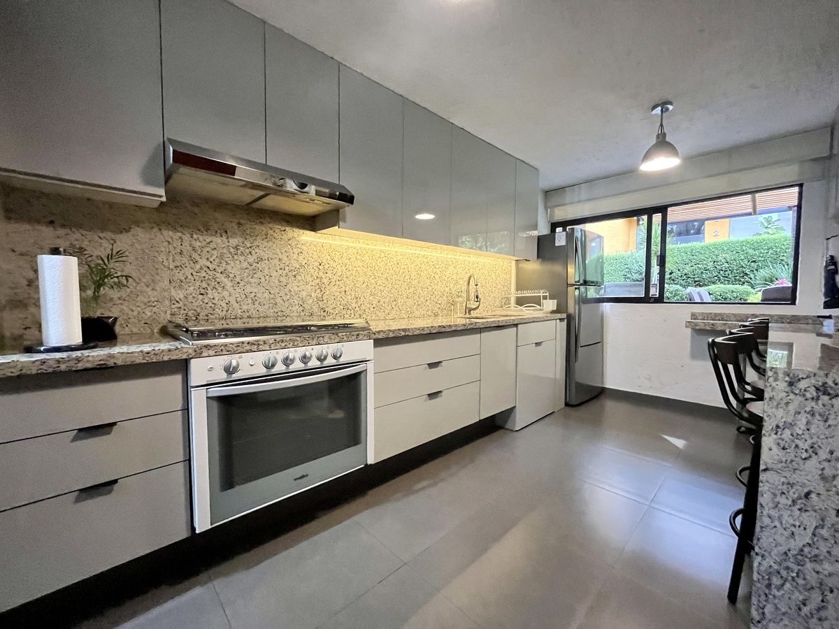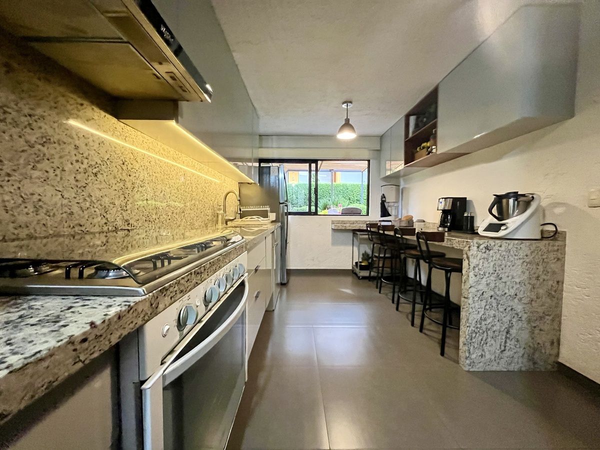 Moderna cocina integral con doble tarja, barra desayunadora, cubiertas de granito, tiene una alacena de muy buen tamaño. En la parte trasera de la cocina se encuentra el área de lavado y el cuarto de servicio.