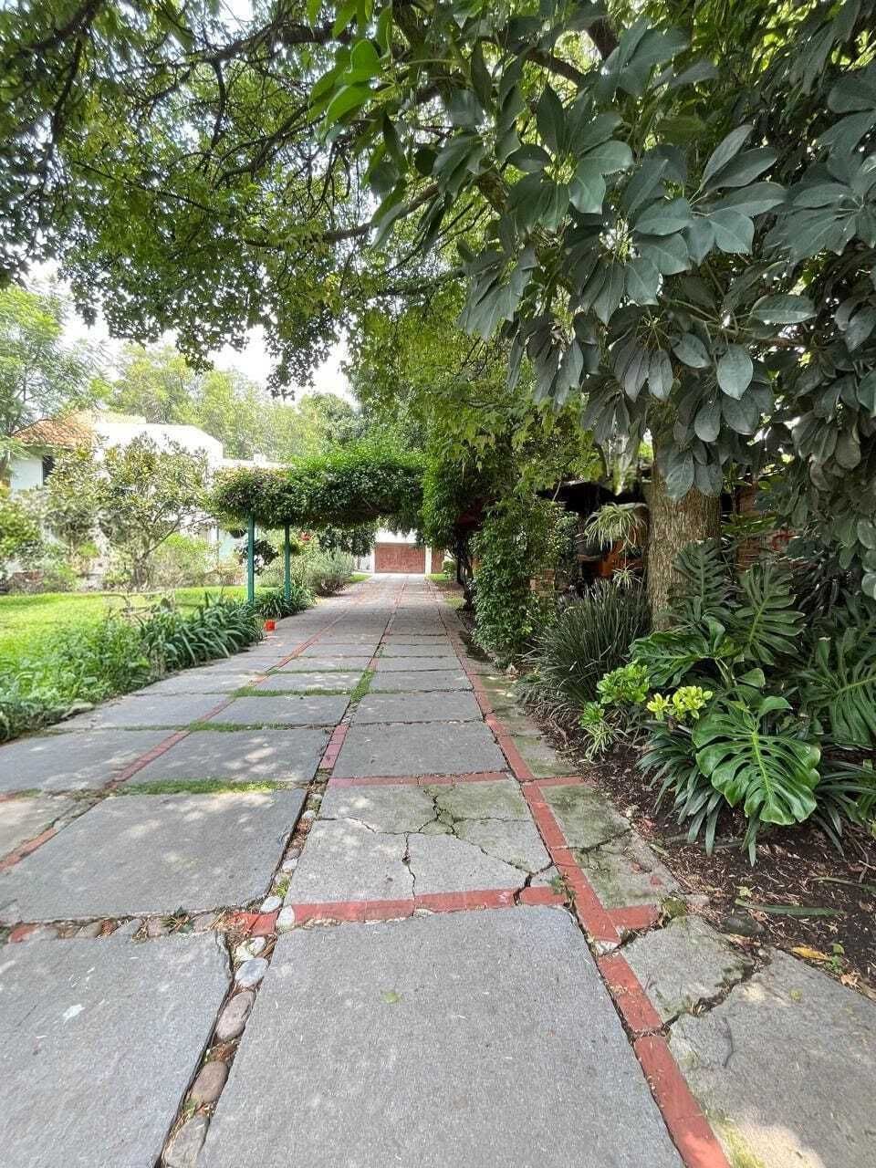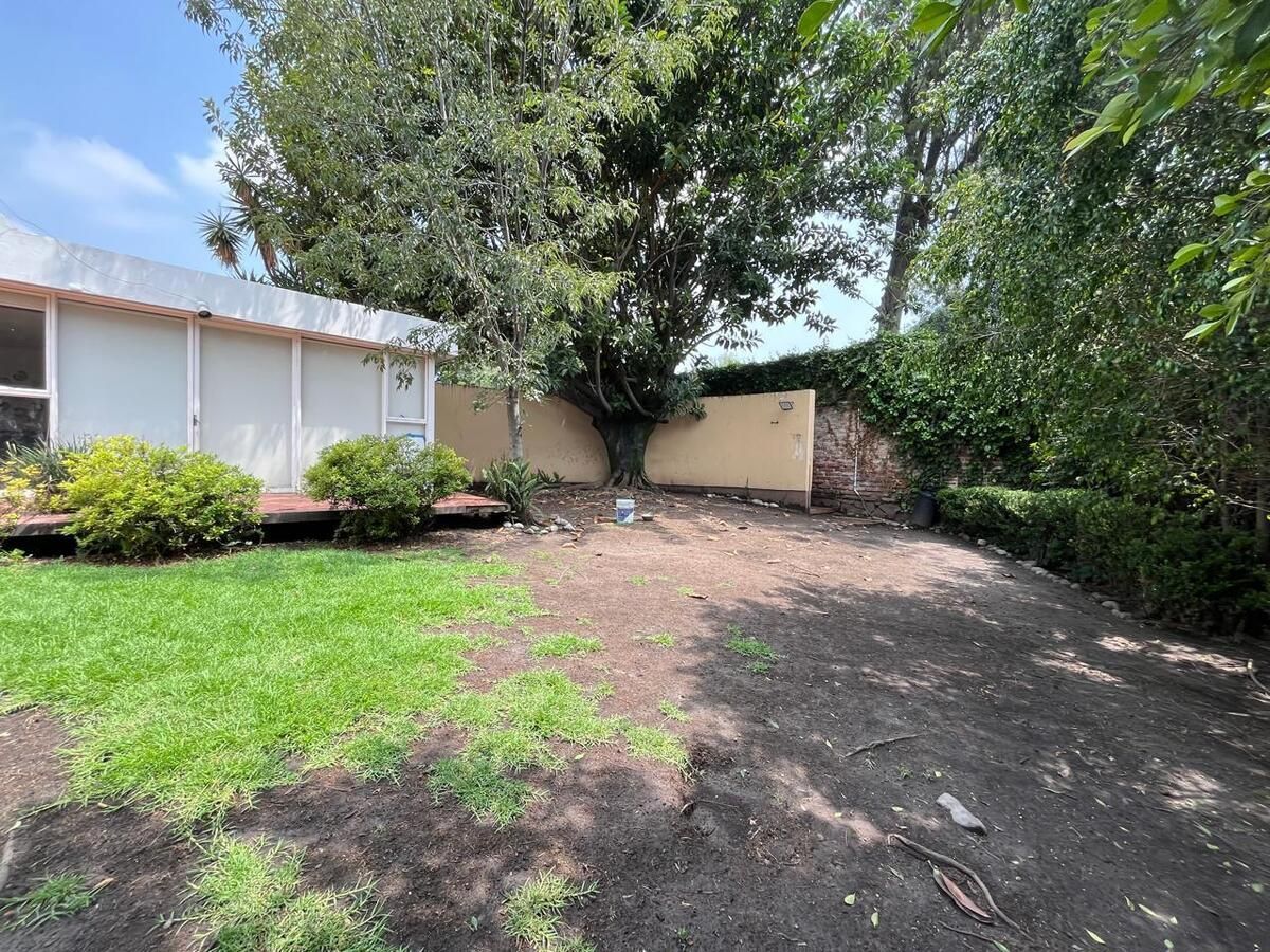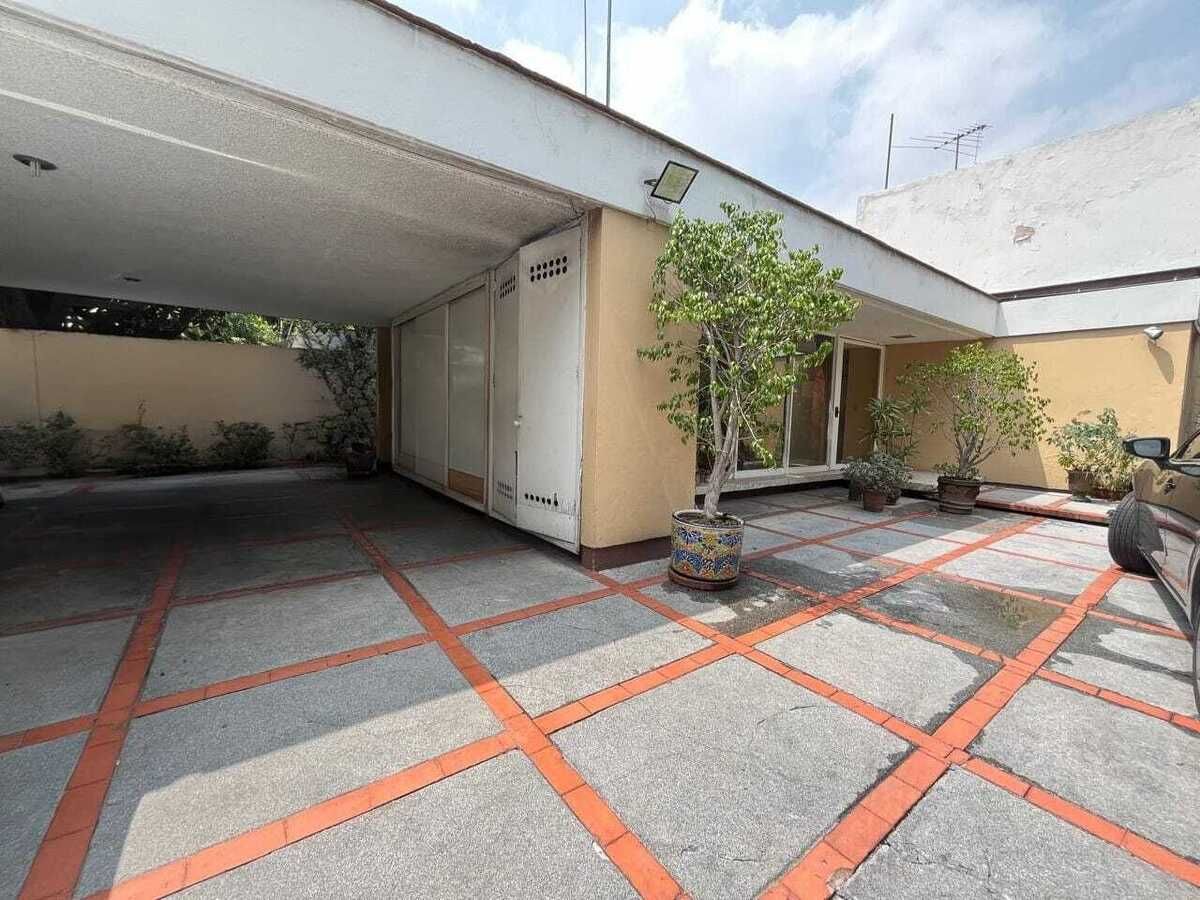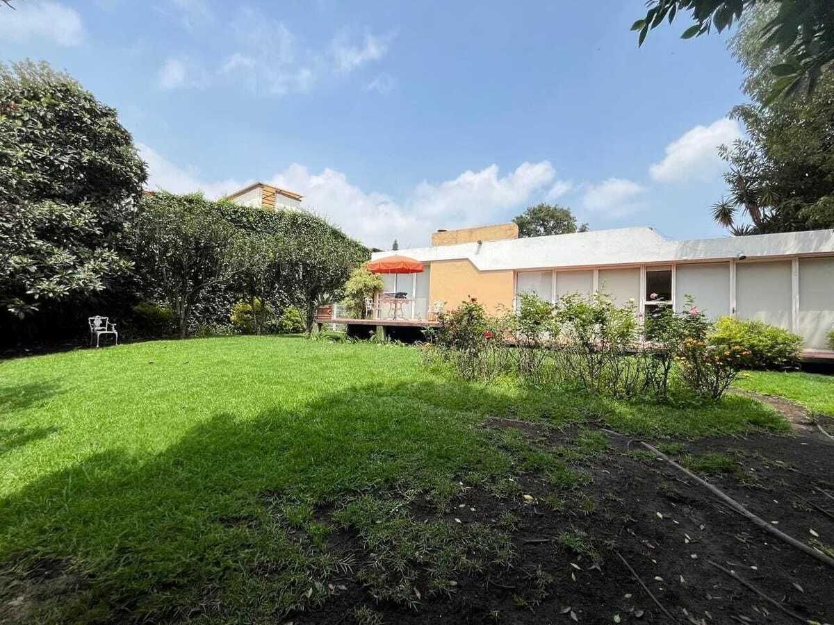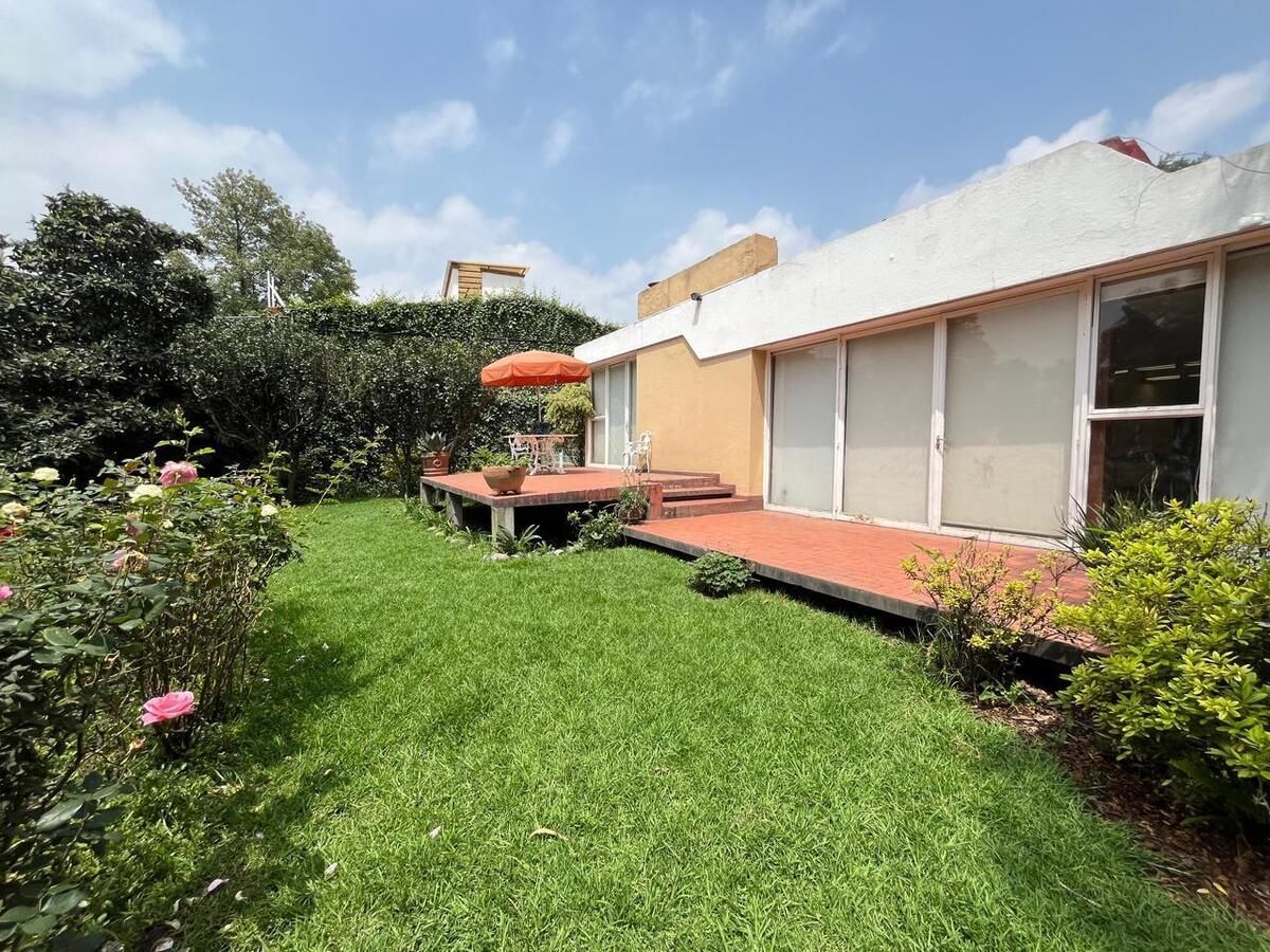 La casa está en el centro del terreno en un piso, entrada principal, entrada de servicio y acceso lateral al jardín trasero. Jardín, terraza, estacionamiento techado para 4 autos, estancia, comedor, bar, baño de visitas, sala de TV, despacho, recámara con clóset y baño, 2 recámaras con clóset, baño compartido, estudio, cocina, antecomedor, bodega.