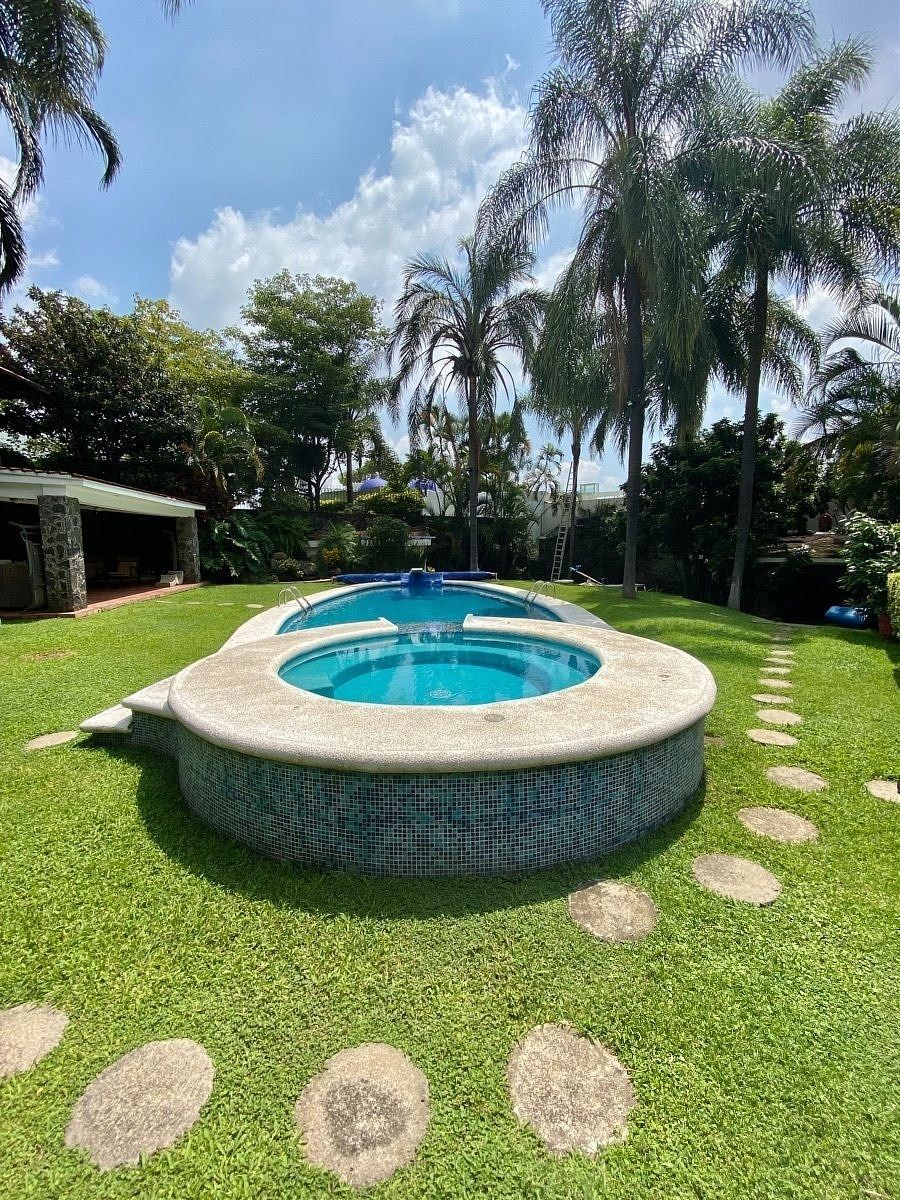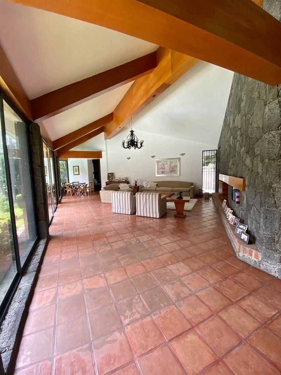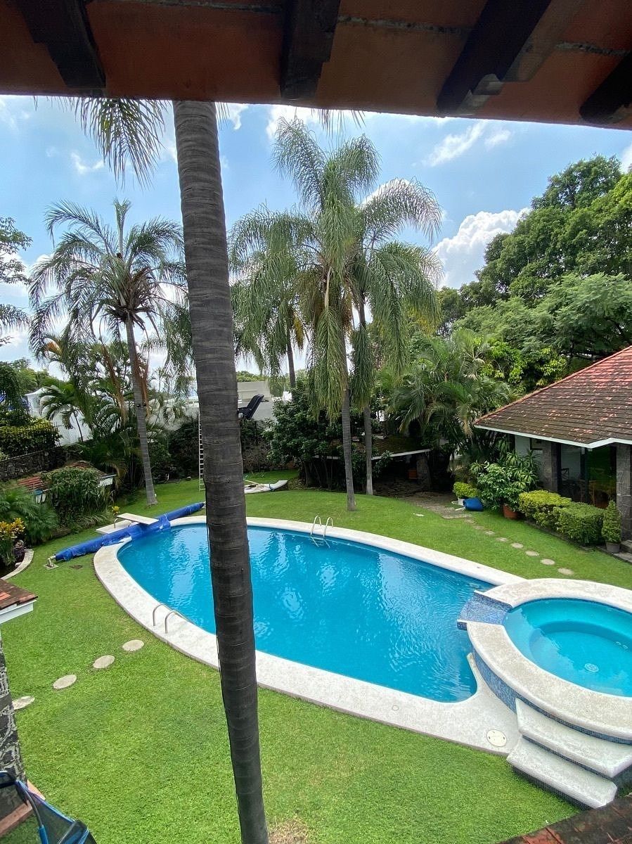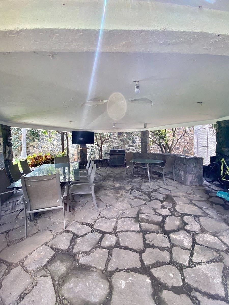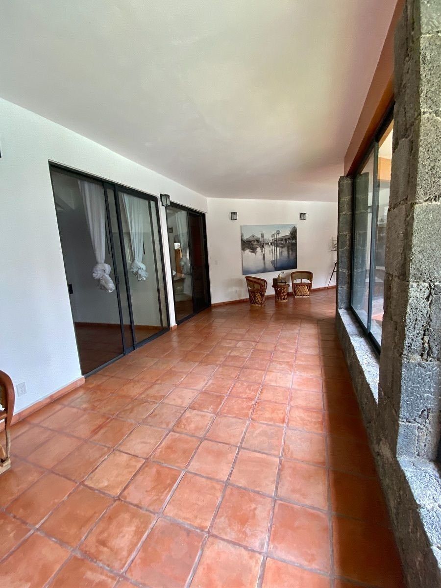 Amplia sala comedor con salida a un arbolado jardín con alberca y jacuzzi, terraza con asador, sala de descanso, sala de tv, cocina integral con isla y gran área de almacenaje, medio baño de visitas, cancha de frontón, 6 autos, 2 cuartos de servicio con baño y área de lavado.