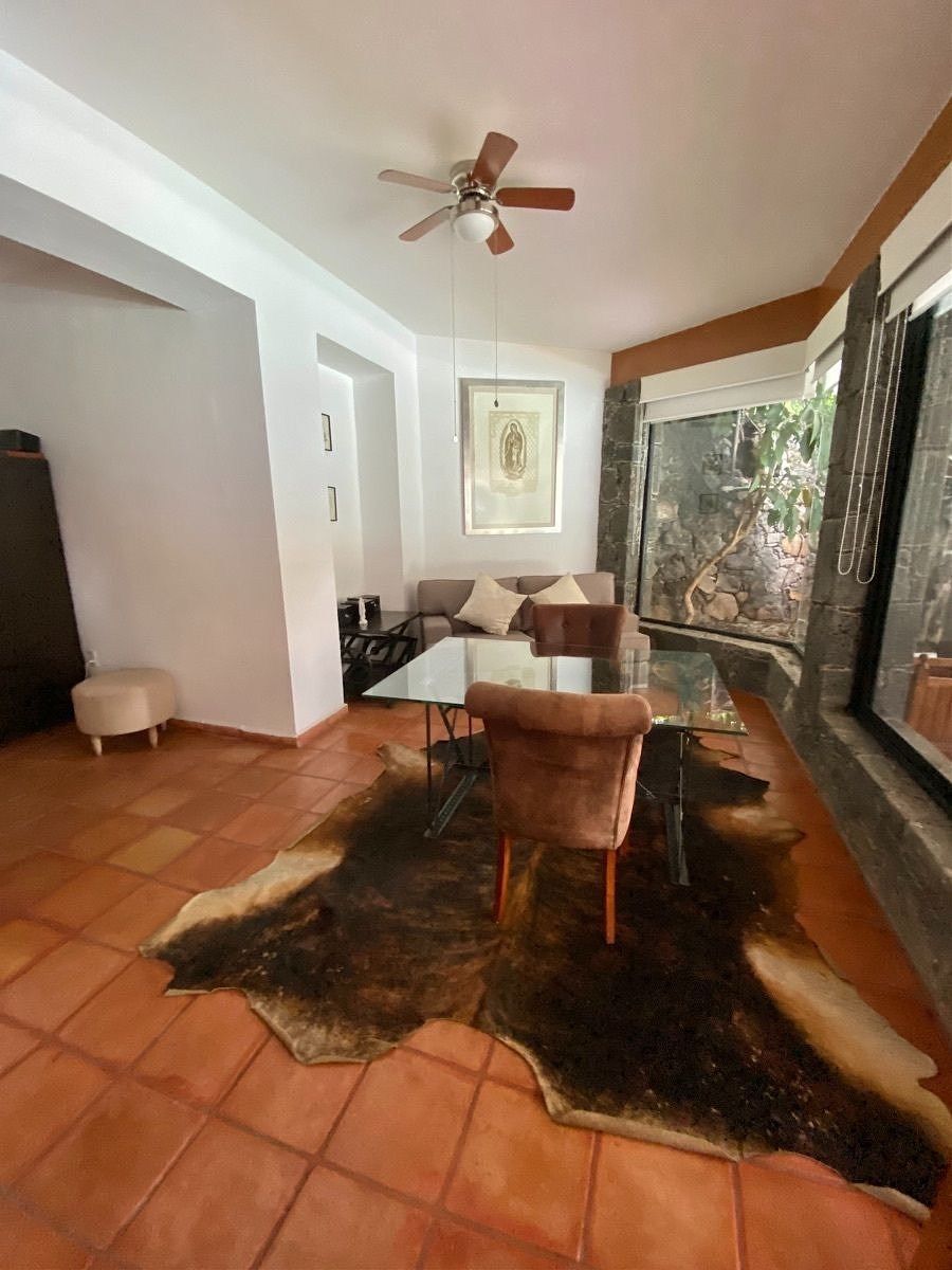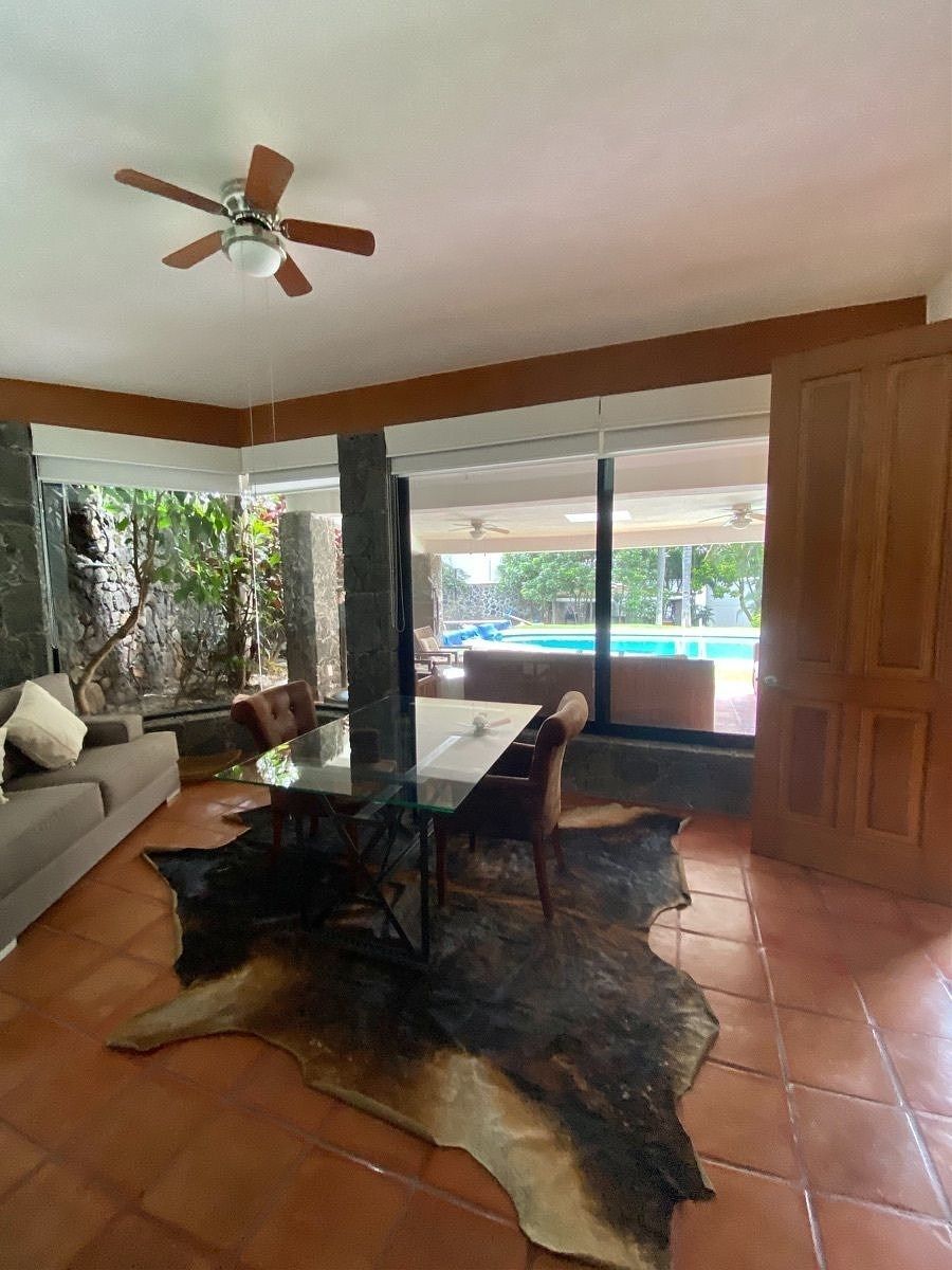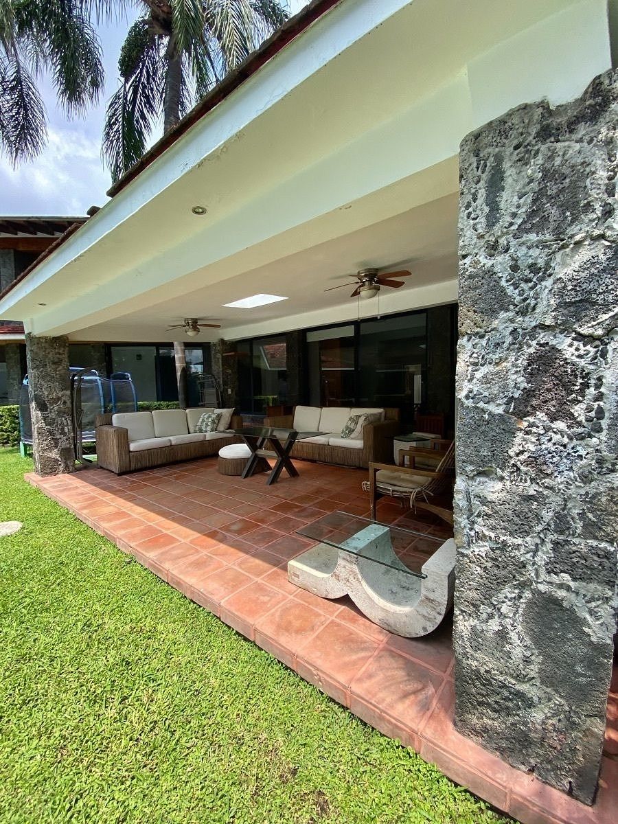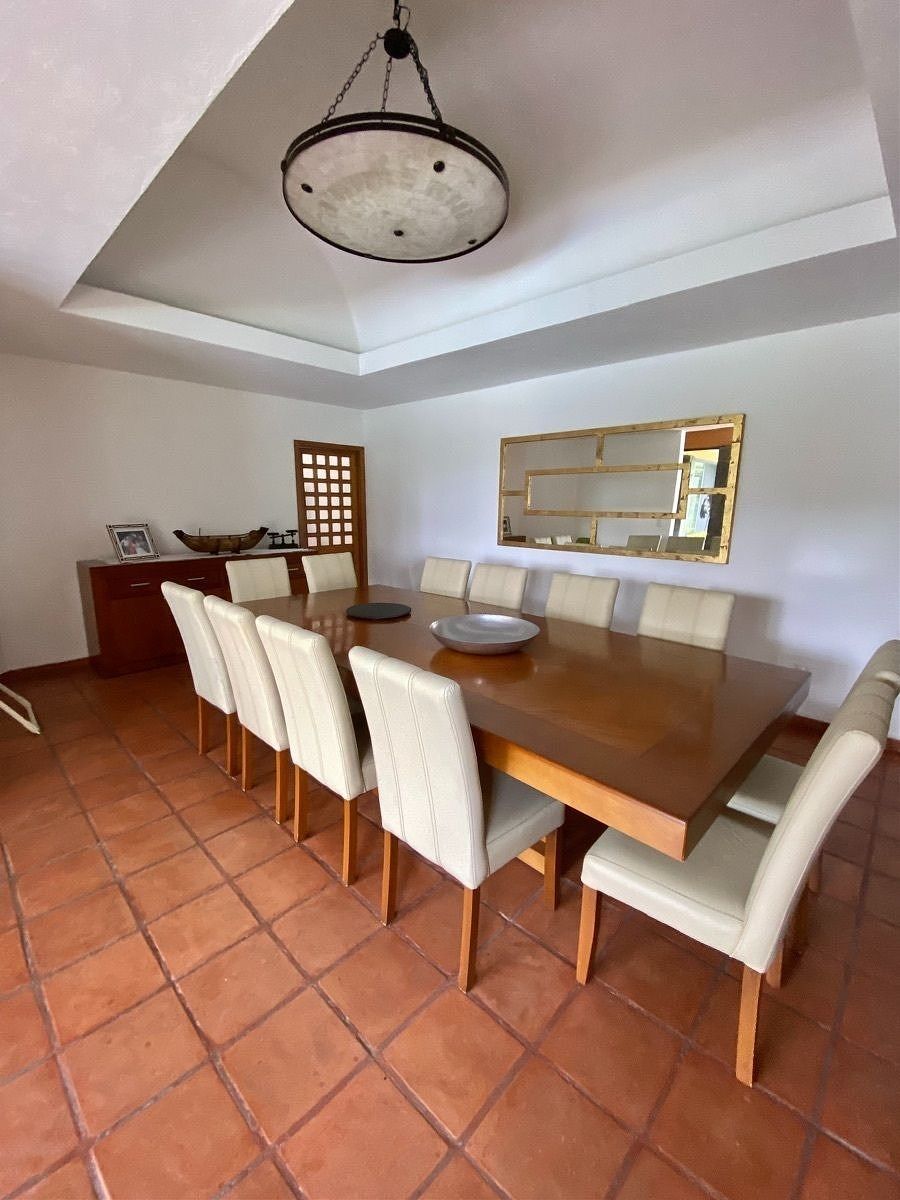 Amplia sala comedor con salida a un arbolado jardín con alberca y jacuzzi, terraza con asador, sala de descanso, sala de tv, cocina integral con isla y gran área de almacenaje, medio baño de visitas, cancha de frontón, 6 autos, 2 cuartos de servicio con baño y área de lavado.