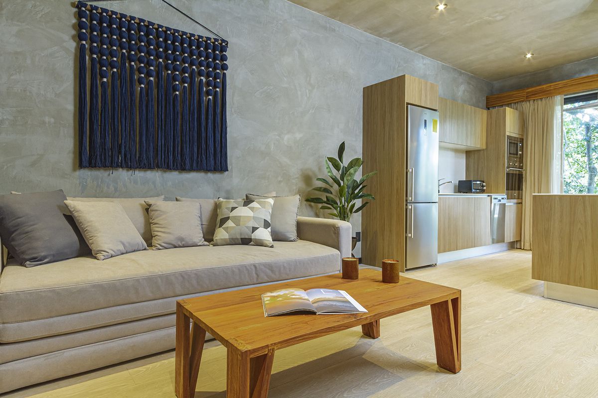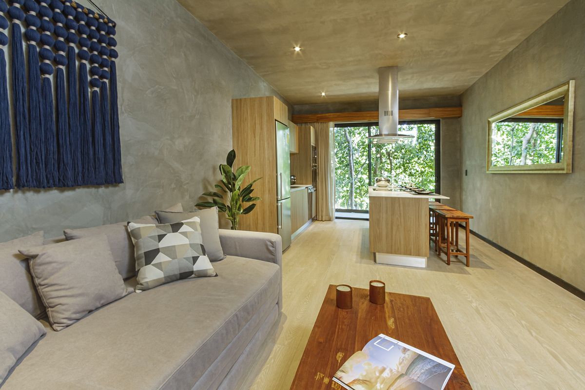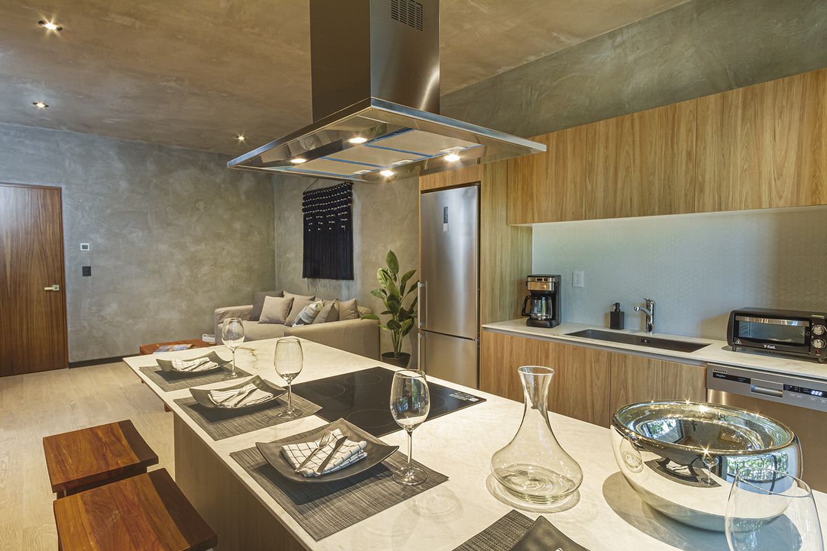 Consta de estancia con sillón, mesa de centro, cocina integral con cubierta de granito, isla con barra desayunadora y bancos, torre de hornos, lavavajillas, refrigerador, balcón, una recámara con cama con buros, balcón y un baño completo, con canceles de cristal templado.