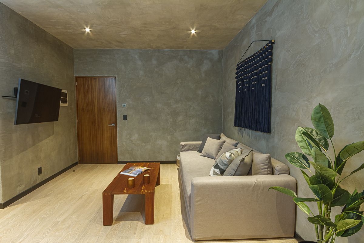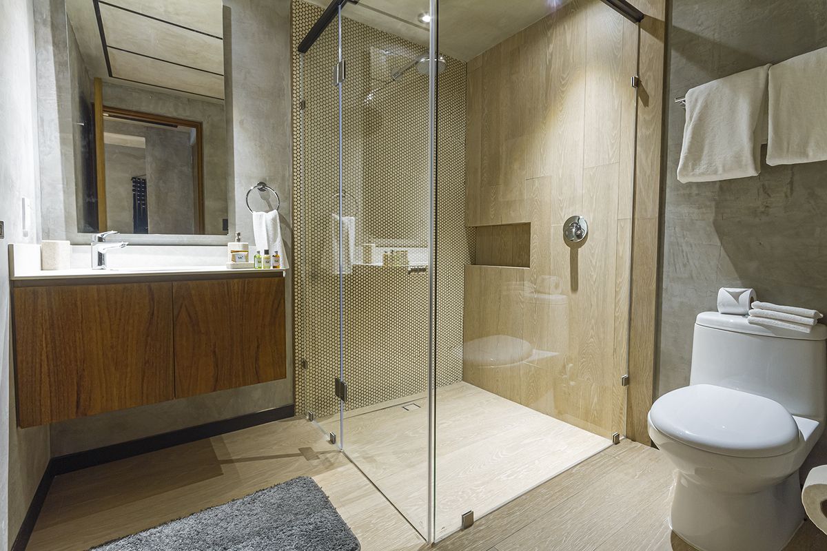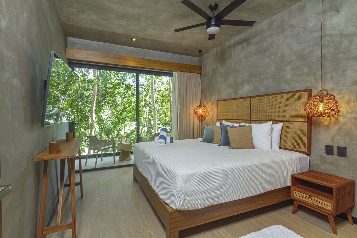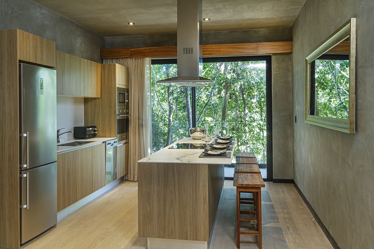 Consta de estancia con sillón, mesa de centro, cocina integral con cubierta de granito, isla con barra desayunadora y bancos, torre de hornos, lavavajillas, refrigerador, balcón, una recámara con cama con buros, balcón y un baño completo, con canceles de cristal templado.