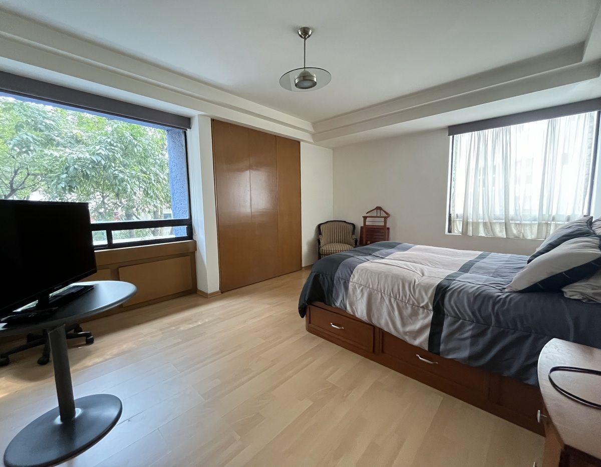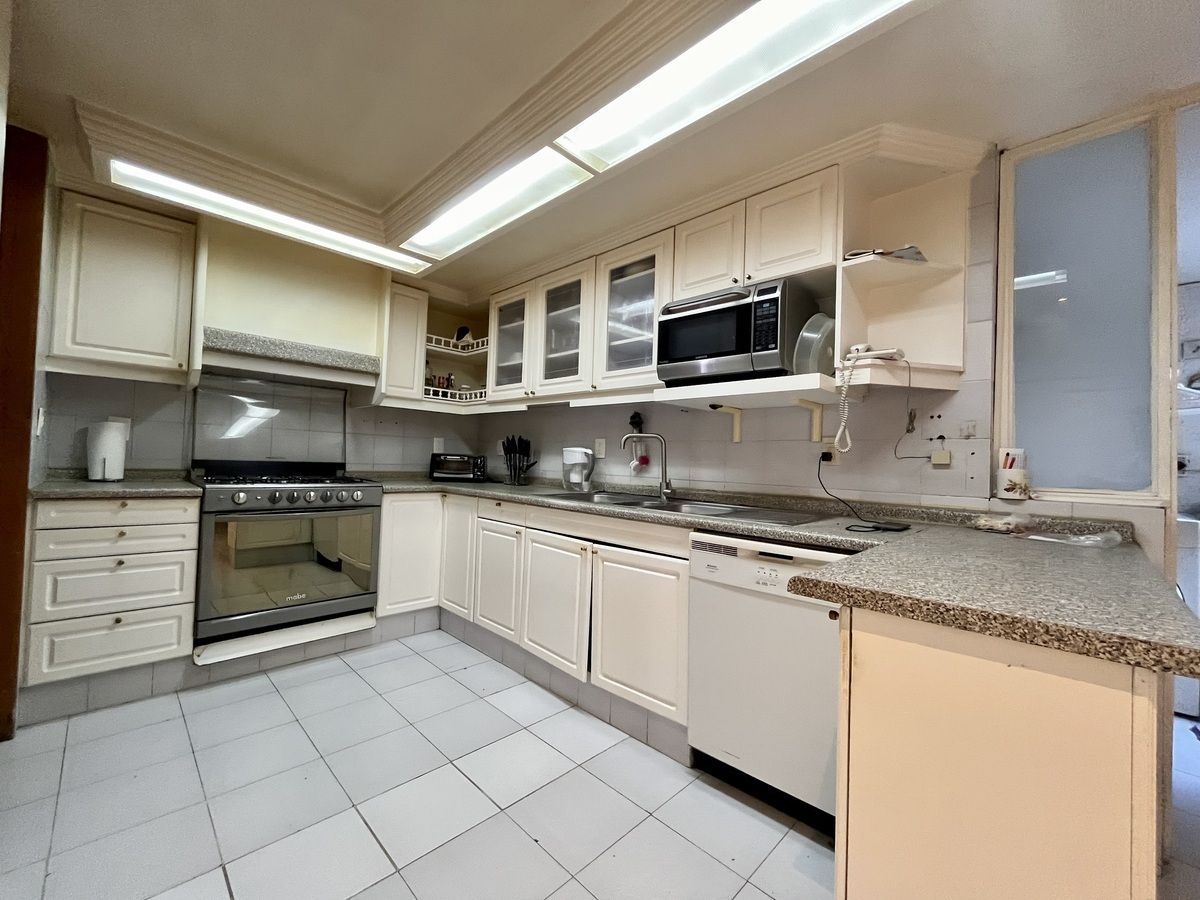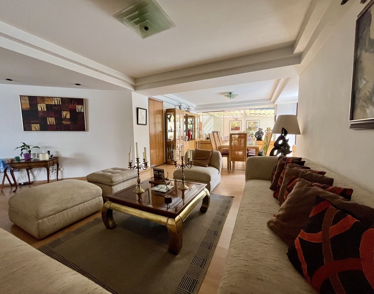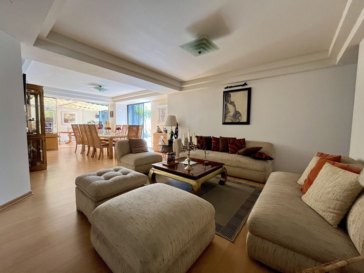 Comodo departamento ubicado en un primer piso totalmente amueblado, consta de una muy espaciosa estancia, sala comedor y área de bar con salida a una amplia terraza, cocina integral con antecomedor, family room, medio baño de visitas, 3 recamaras, la principal con vestidor, baño y salida a la terraza, las otras 2 recamaras con baño cada una y closets de piso a techo, cuarto de servicio y área de lavado integrados al departamento.