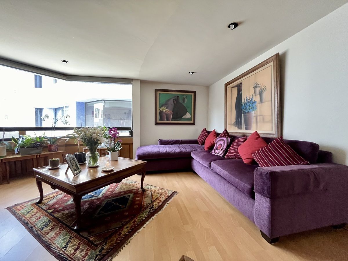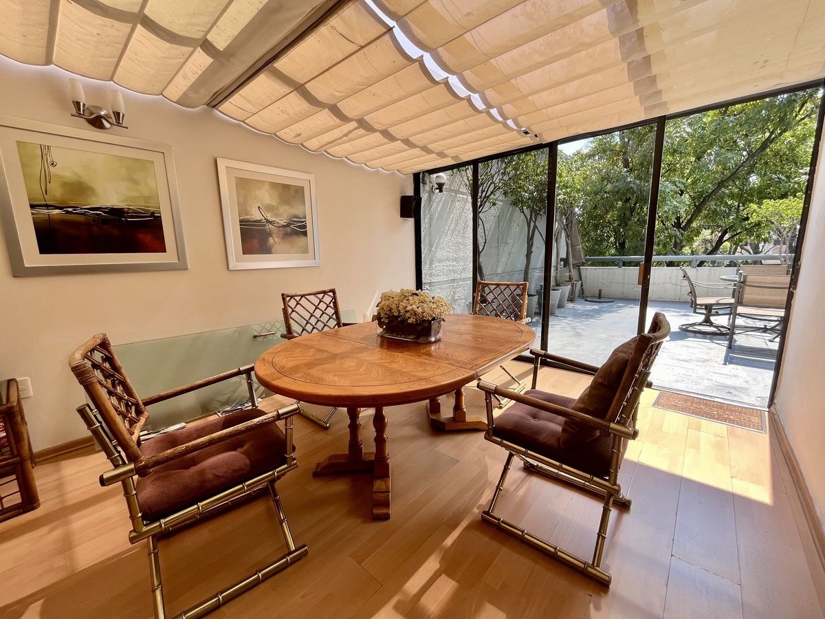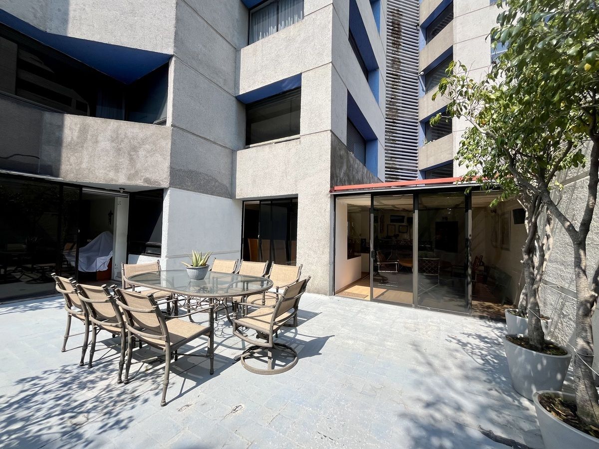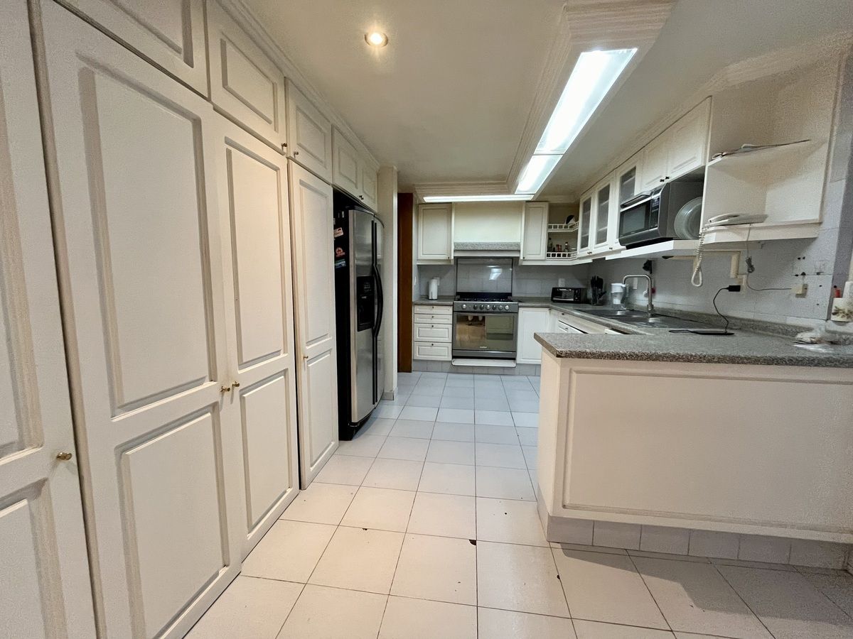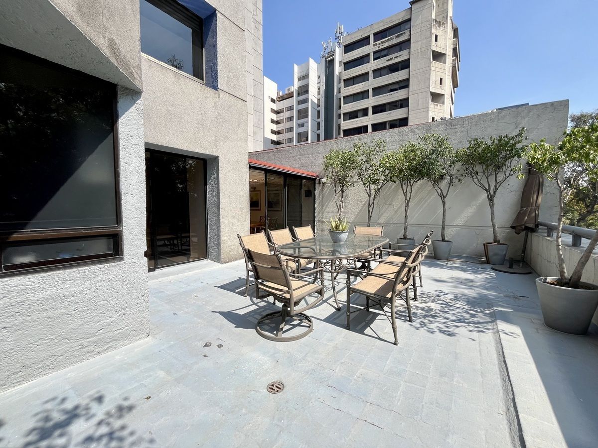 Comodo departamento ubicado en un primer piso totalmente amueblado, consta de una muy espaciosa estancia, sala comedor y área de bar con salida a una amplia terraza, cocina integral con antecomedor, family room, medio baño de visitas, 3 recamaras, la principal con vestidor, baño y salida a la terraza, las otras 2 recamaras con baño cada una y closets de piso a techo, cuarto de servicio y área de lavado integrados al departamento.