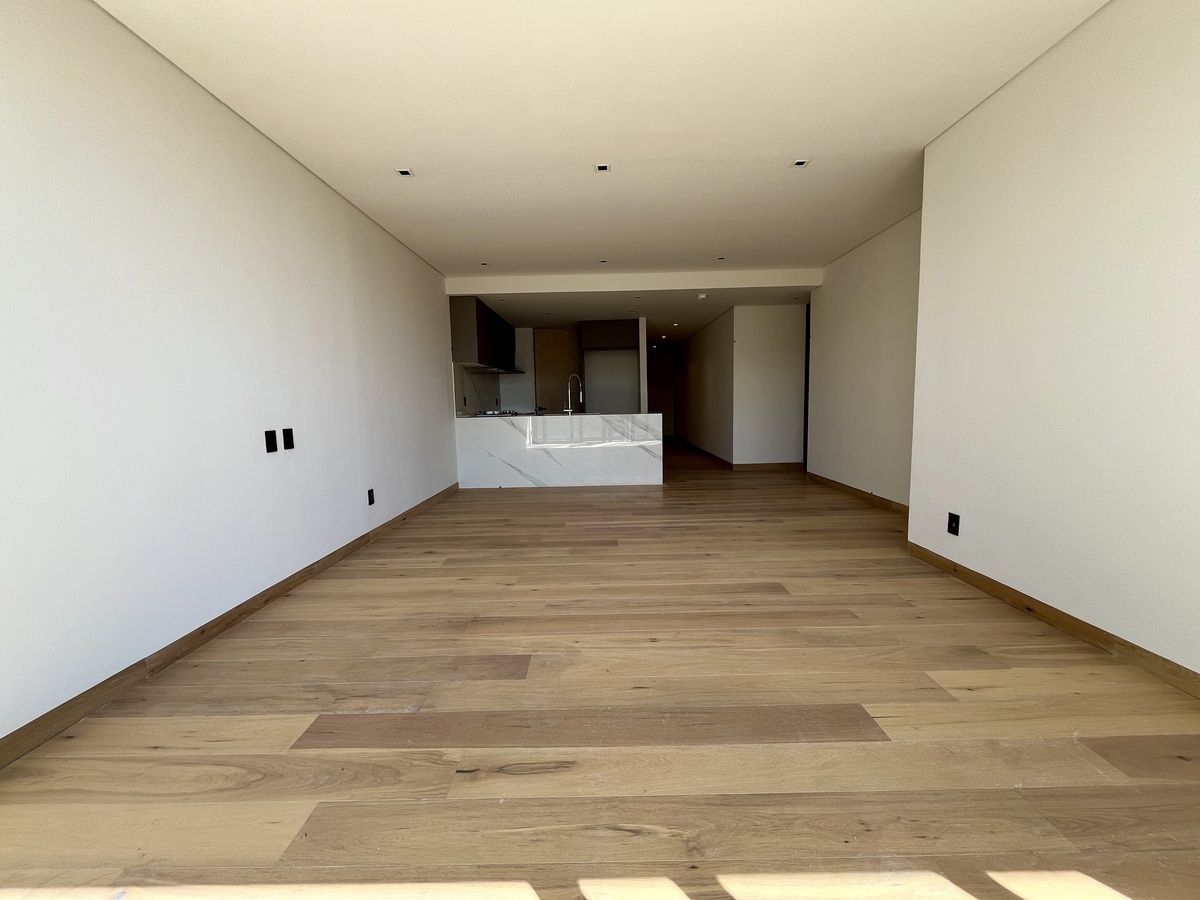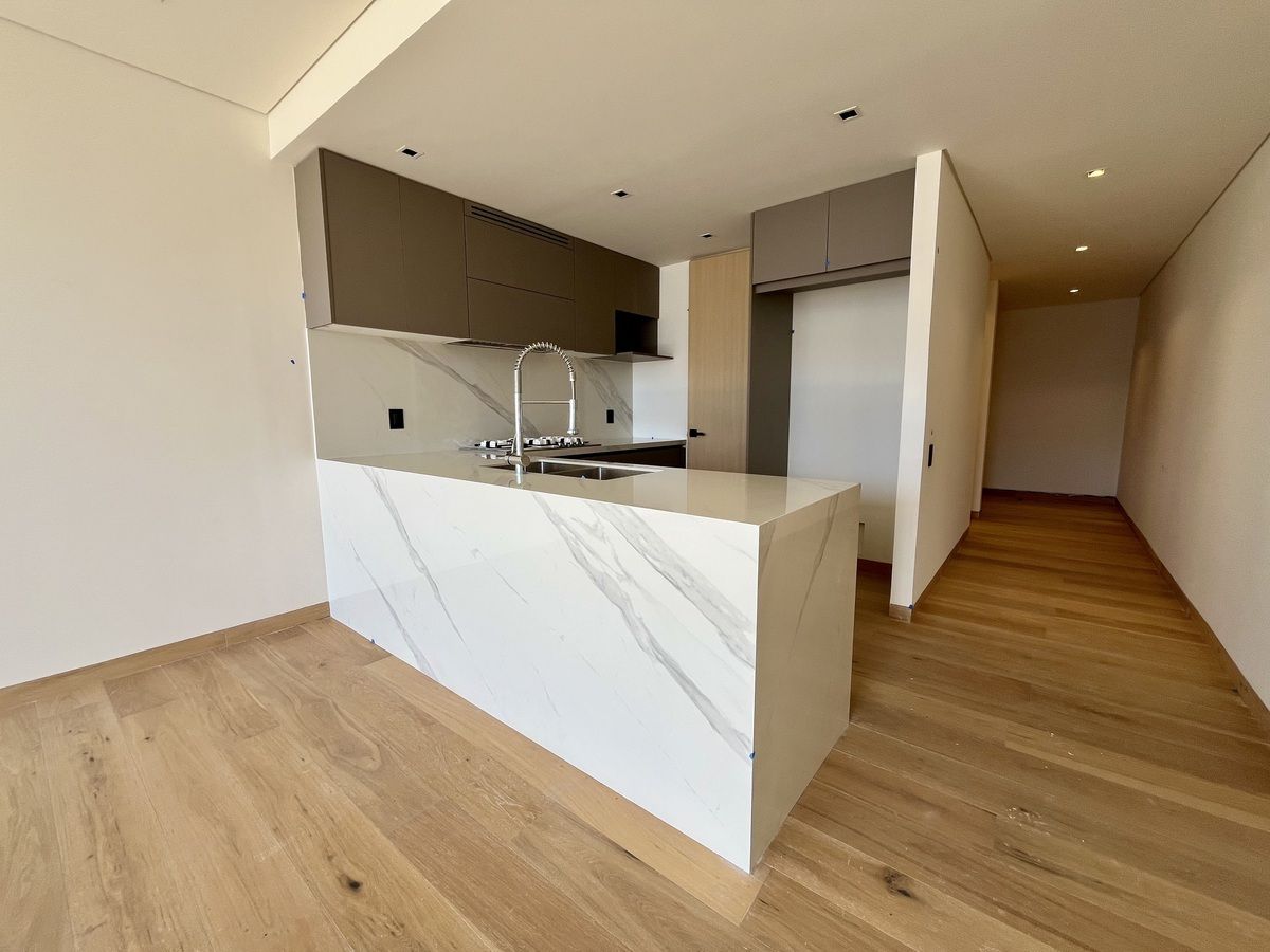 Cuenta con amplia estancia con salida a un balcón, cocina abierta con cubiertas de mármol y área de lavado integrada,medio baño de visitas.