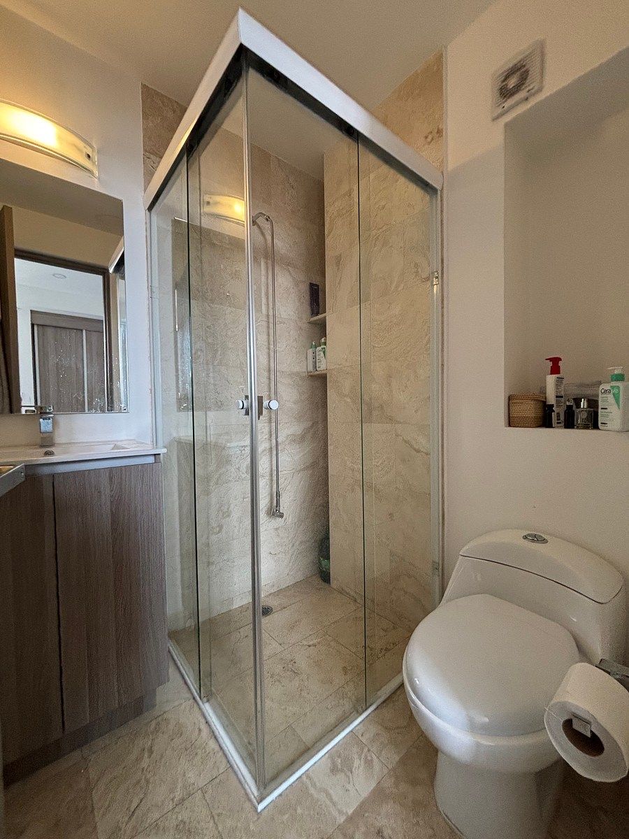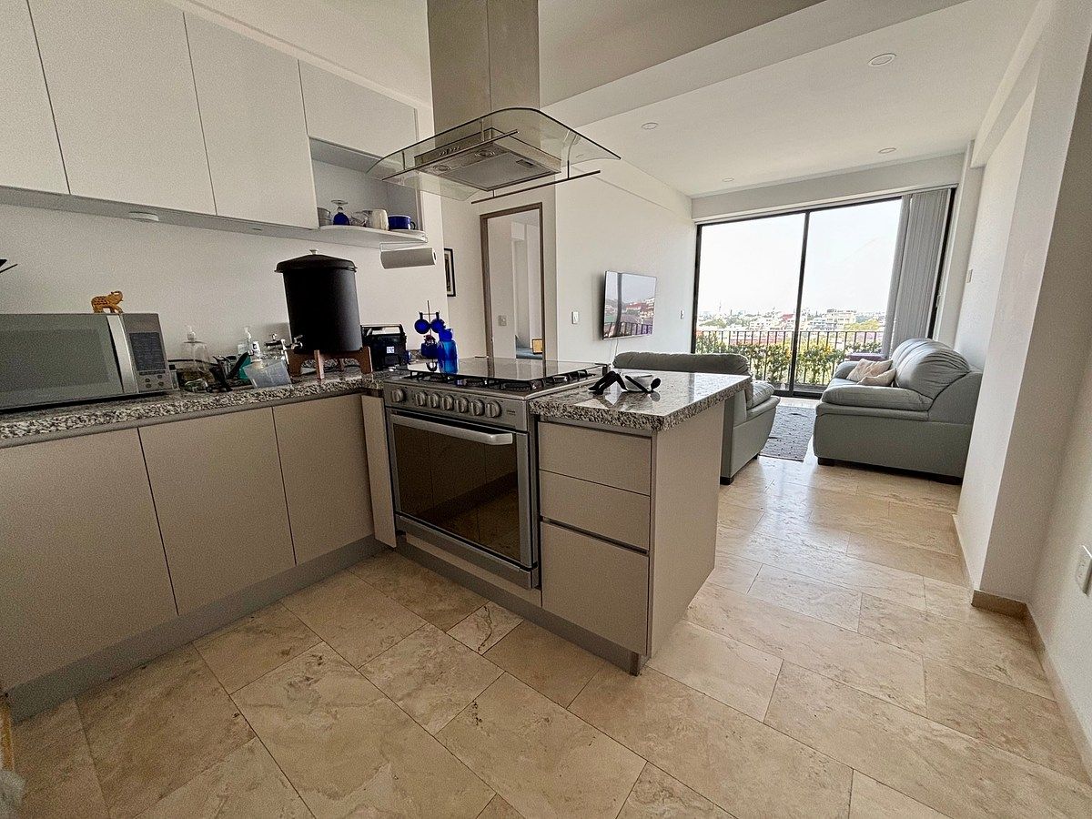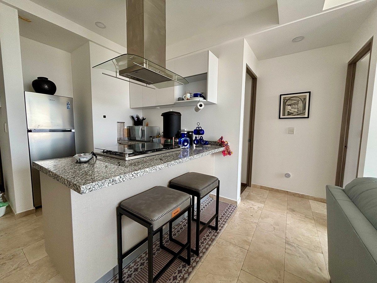 Cocina Integral estilo abierto con barra de granito, 2 habitaciones, la principal con baño privado; la secundaria con clóset de piso a techo y comparte baño con el área social y un espacio independiente de área de lavado.